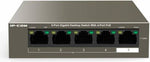 G1105P-4-63W is a IP-COM PoE switch that offers 5 10/100/1000 Mbps Base-TX RJ45 ports. Ports 1-4 comply with the IEEE 802.3af standard (maximum PoE power output: 15.4 W) and 802.3at standard (maximum PoE power output: 30 W). The switch offers a maximum PoE power output of 58 W and can supply power to and exchange data with APs, IP cameras, and IP phones through CAT5 cables. It also provides simple management modes such as VLAN, to help reduce cabling costs of IP terminals like APs and IP cameras.